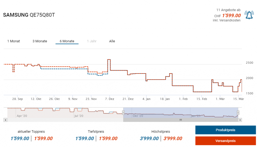 Bei Fust gibts derzeit den Fernseher Samsung QE75Q80T mit Full-Array-Local-Dimming und HDMI 2.1 Schnittstelle (für 120 Hz Gaming) zum Aktionspreis von CHF 1599.90. Laut toppreise solls den Preis schon seit einer Weile geben, allerdings gabs bisher nur einen Deal dazu vor einem Monat.
