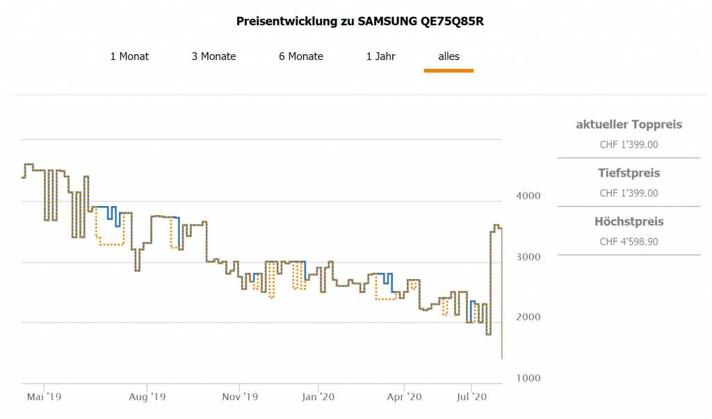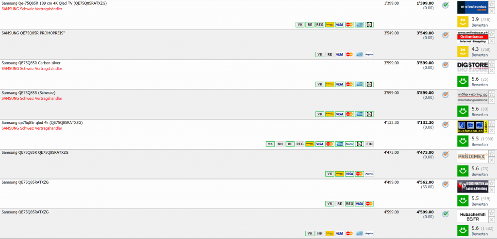 Bei melectronics gibt’s gerade den SAMSUNG QE75Q85R zum neuen Bestpreis von CHF 1399.- Vormaliger Bestpreis war bei CHF 1799.- Ich nehme das auch als Vergleichspreis, da die anderen Vergleichspreise deutlich überhöht sind. Wer noch x-fach Cumulus-Punkte hat, sollte sie hier einsetzen. Zudem lässt sich der 10.- Gutscheincode einsetzen, den man für die Newsletter-Anmeldung erhält (setzt Migros Login voraus)