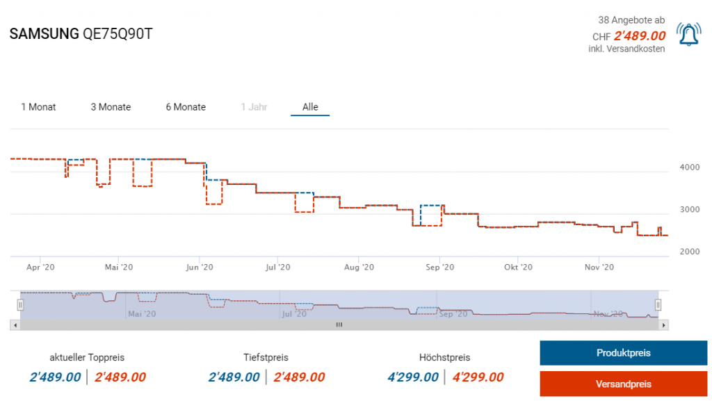 Bei digitec gibts derzeit den 75 Zoll grossen Q90T Fernseher zum neuen Bestpreis von CHF 1999.-. Laut toppreise liegt der zweittiefste Preis bei CHF 2489.- was scheinbar auch der bisherige Bestpreis gewesen sein soll.