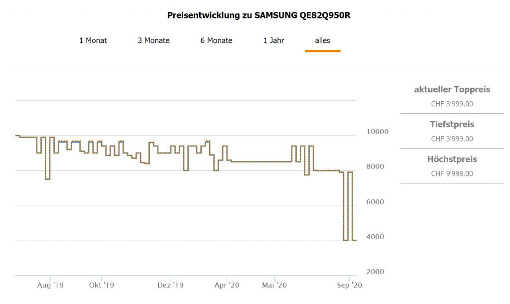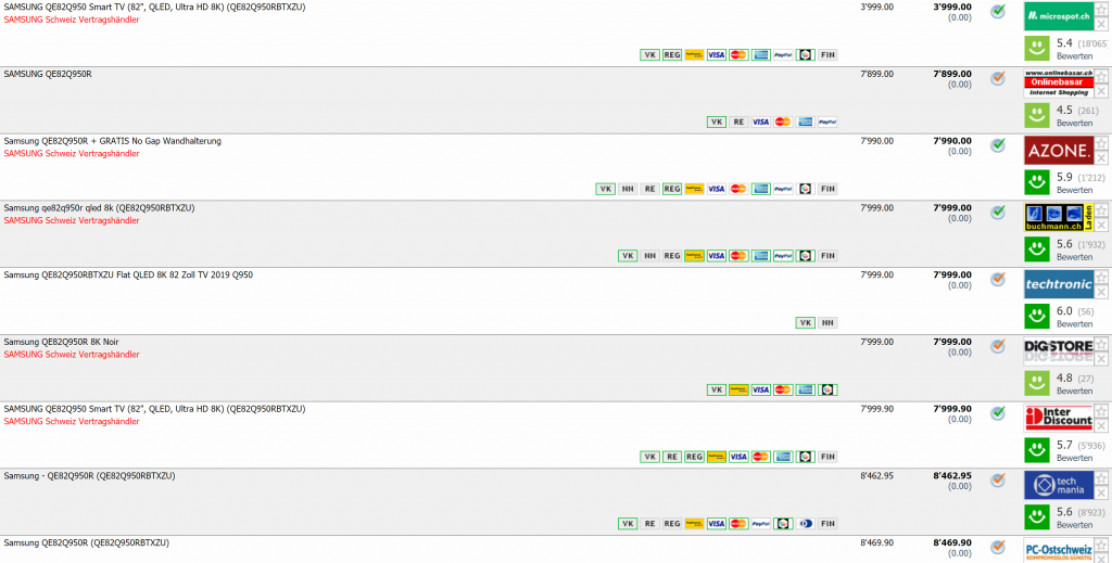 Bei microspot gibt’s gerade den 82” TV SAMSUNG QE82Q950R für CHF 3’999.- Zweitbester Preis beträgt laut toppreise CHF 7899.-