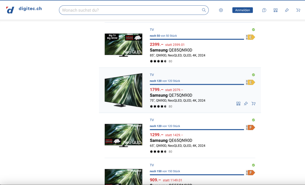 Bei Digitec sind jetzt alle Samsung Geräte der QN90D-Serie zu absoluten Bestpreisen in Promotion. Deutlich unter Black Friday Preisen sogar in allen Zollgrössen.
