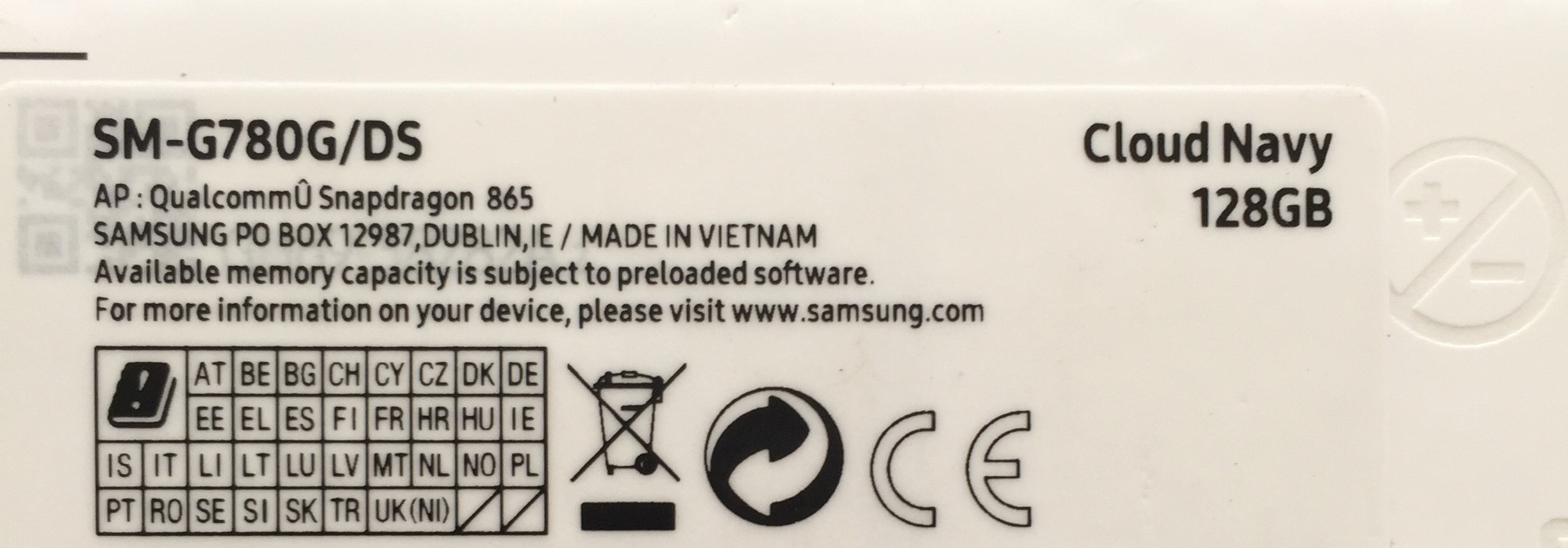 Weiter unten die Etikette von meinen S20 FE, auf Zeile 2 kann man den Prozessor erkennen.