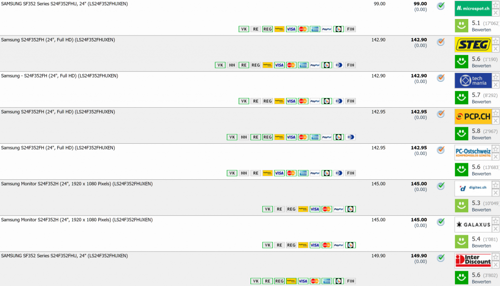 Zweitbester Preis für den Monitor liegt bei CHF 142.90, Bestpreis war soweit ersichtlich bei CHF 99.90