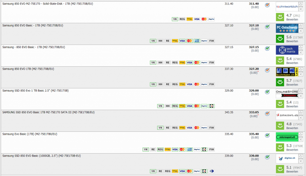 In der Schweiz fängt der Preis bei CHF 311.40 an, wobei der erste seriöse Shop die SSD für CHF 327.10 im Angebot hat. Unter CHF 289.- gab’s die Samsung SSD 850 EVO interne 1TB Festplatte in der Schweiz noch nie.