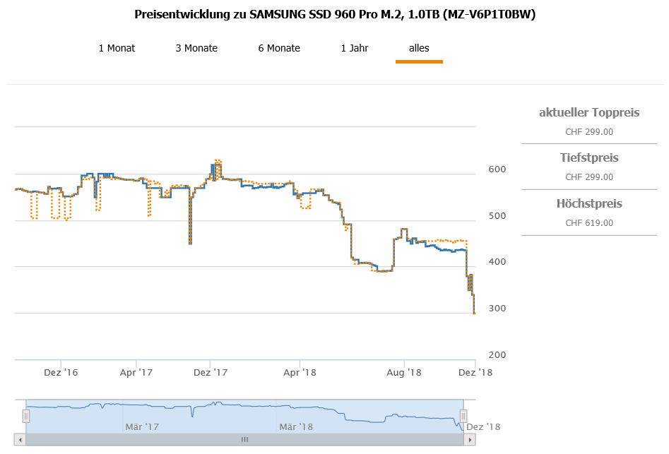 Bei microspot gibt es aktuell die SAMSUNG SSD 960 Pro M.2 mit 1.0TB für 299.- CHF. Gemäss toppreise war der bestprice bislang bei 339.- CHF, was aktuell auch der zweitbeste Preis ist.