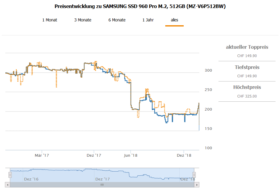 Bei alternate gibt es aktuell die SAMSUNG SSD 960 Pro M.2, 512GB für 164.90 CHF inkl. Versand (Schweizer MwSt. und Verzollung).