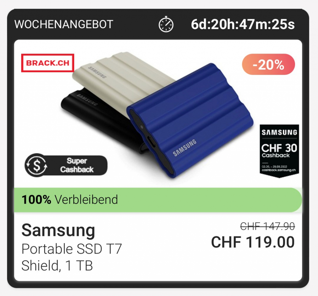 Aktuell gibt es auf Twint die Samsung SSD T7 Shield für CHF 119.-. Wenn ich das richtig sehe, müsste dies die neueste Generation sein, welche erst gerade von Samsung gelauncht wurde.