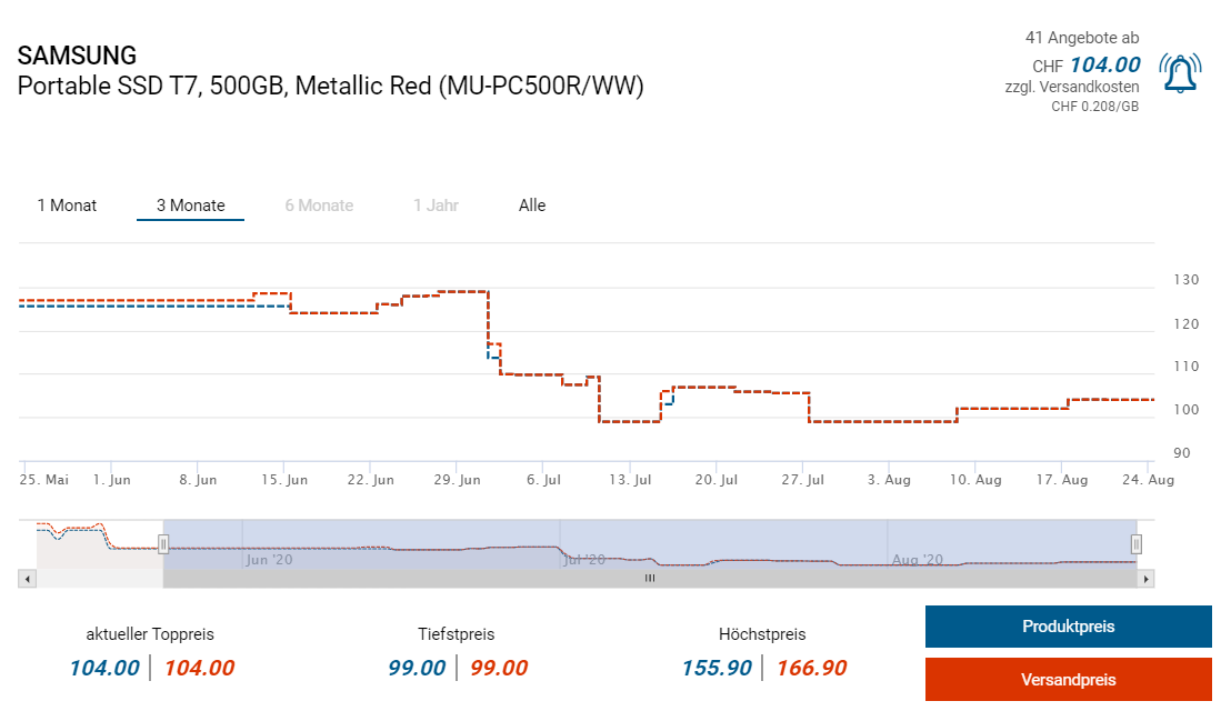 Bei Daydeal gibts heute die 500GB umfassende SSD T7 zum neuen Bestpreis von 79 Franken. Laut toppreise betrug der vergangene Bestpreis zwischen 97 und 99 Franken, den zweitbesten Preis gibts derzeit bei Amazon für ca. 95 Franken.