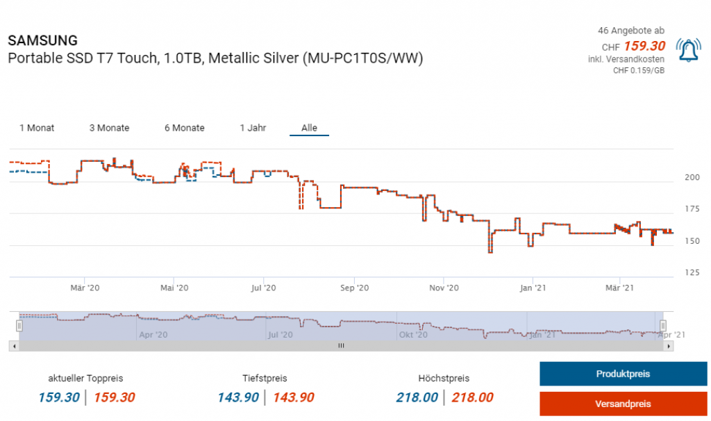 Bei ARP gibt’s derzeit die 1TB fassende T7 Touch SSD von Samsung zum Aktionspreis von knapp CHF 159.-. Allerdings spart ihr durch den Newsletter-Gutschein weitere 20 Franken und kommt so auf CHF 137.25. Durch die Cashback-Promotion gibt’s zudem 50 Franken aufs Bankkonto zurück und ihr erreicht so den Dealpreis von CHF 88.80. Microspot ist dabei der zweitgünstigste Anbieter mit CHF 108.95 nach Abzug des Cashbacks.