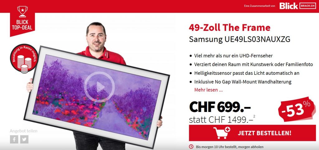 Der Smart-TV überzeugt durch 4K-UHD-Auflösung, 49-Zoll-Bildschirm und HDR 1000 für hohe Spitzenhelligkeit und damit grossen Kontrastumfang. «The Frame» ist aber mehr als nur ein Fernseher. Mit der No-Gap-Wandhalterung sitzt er perfekt an jeder Wand und wird im Art-Modus zu einem einzigartigen Kunstwerk.
