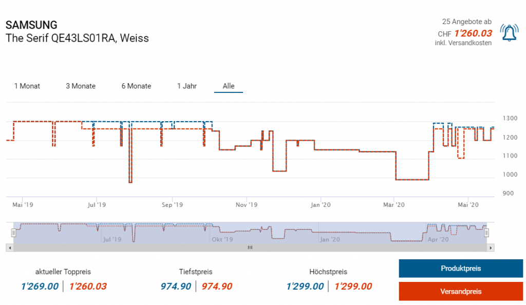 Den 43 Zöller gibts für 699 Franken, zweitbester Preis CHF 1260.03, gabs nie tiefer als für CHF 974.90