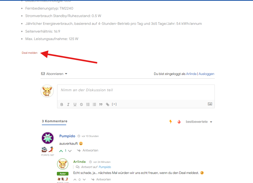 Du kannst den Deal als User melden, indem du auf den Button "Deal melden" klickst. Hier habe ich einen Screenshot für dich: