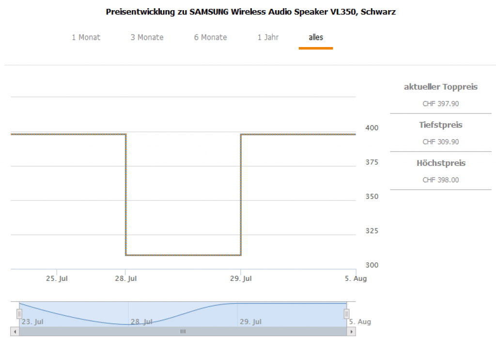 Den SAMSUNG Wireless Audio Speaker VL350 gab es bislang noch nie günstiger als für 309.90 CHF, der aktuell beste Preis liegt bei 397.90 CHF.