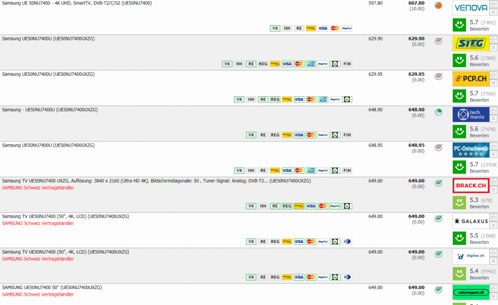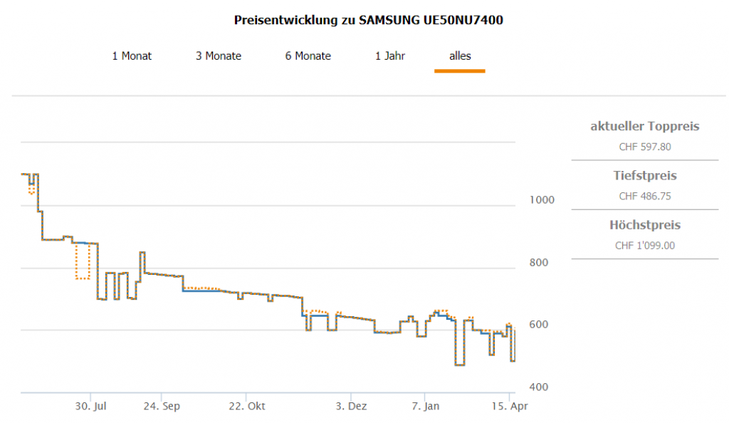 Bei MediaMarkt ist der SAMSUNG UE50NU7400 gerade heruntergesetzt worden. Neu gibt’s den TV für CHF 519.- Zweitbester Preis in der Schweiz macht Venova mit CHF 607.80, wobei die etablierten Händler ca. ab CHF 649.- für den TV verlangen. Ganz zum Bestpreis aber reicht es nicht. Vor zwei Monaten gab’s den TV schon einmal für CHF 486.75.