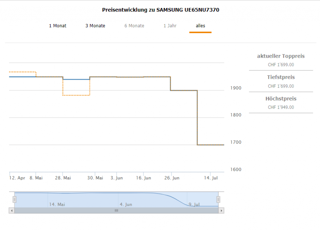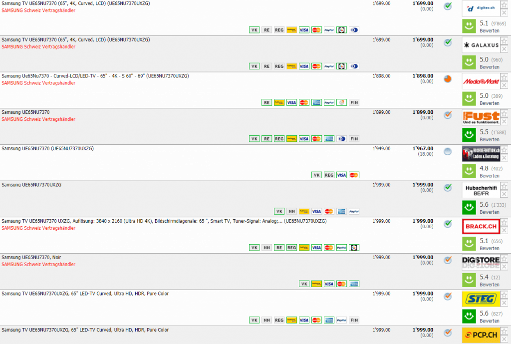 Bei digitec gibt’s gerade den Samsung UE65NU7370 4K 65“ Curved TV für CHF 1’699.- Den zweitbesten Preis bietet MediaMarkt mit CHF 1’898.- Brack möchte sogar CHF 1’999.- für den gleichen TV haben. Der bisherige Bestpreis lag bei CHF 1’898.-