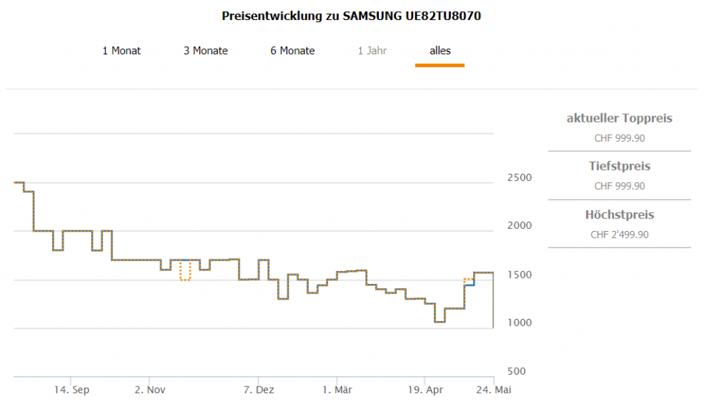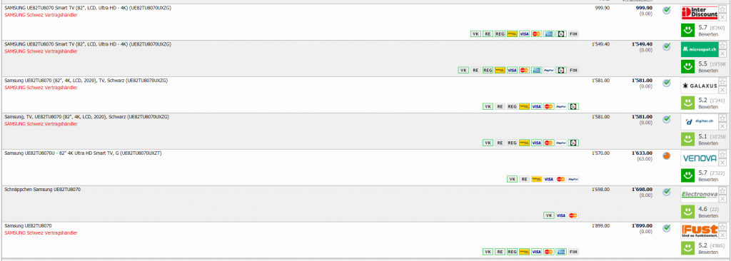 Bei Interdiscount gibt’s den 82 Zöller Samsung UE82TU8070 gerade für CHF 999.90 Mit dem Gutscheincode 150TRAD15 gibt’s nochmals 15.- Rabatt, so bezahlt man nur noch CHF 984.90