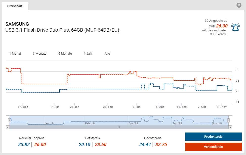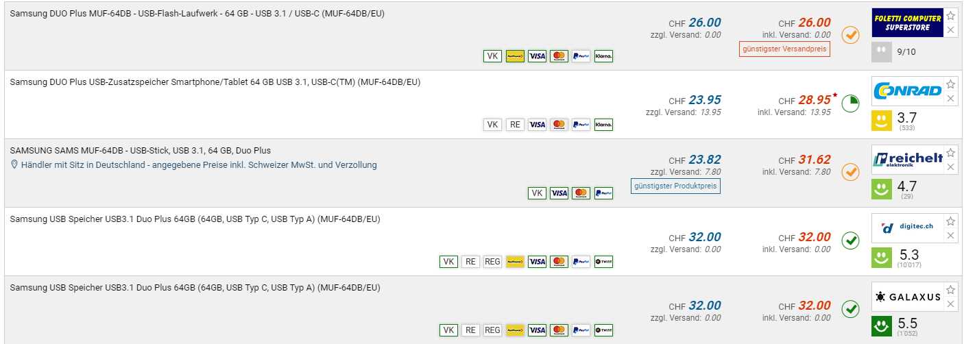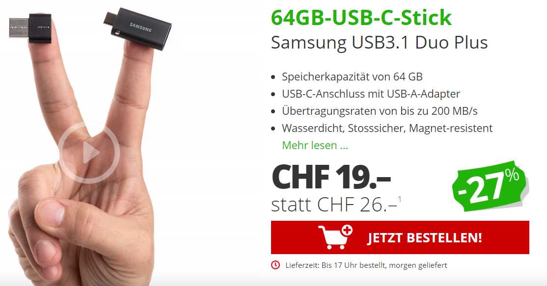 Bei DayDeal gibt es den SAMSUNG USB 3.1 Flash Drive Duo Plus 64GB für den neuen Besptreis von CHF 19.-. Der vorherige Bestpreis war CHF 23.60. Der zweitbeste Preis beträgt CHF 26.-.