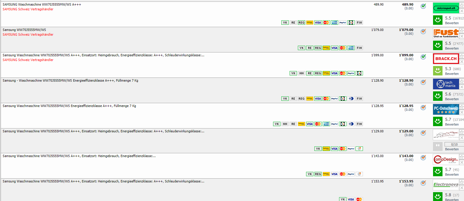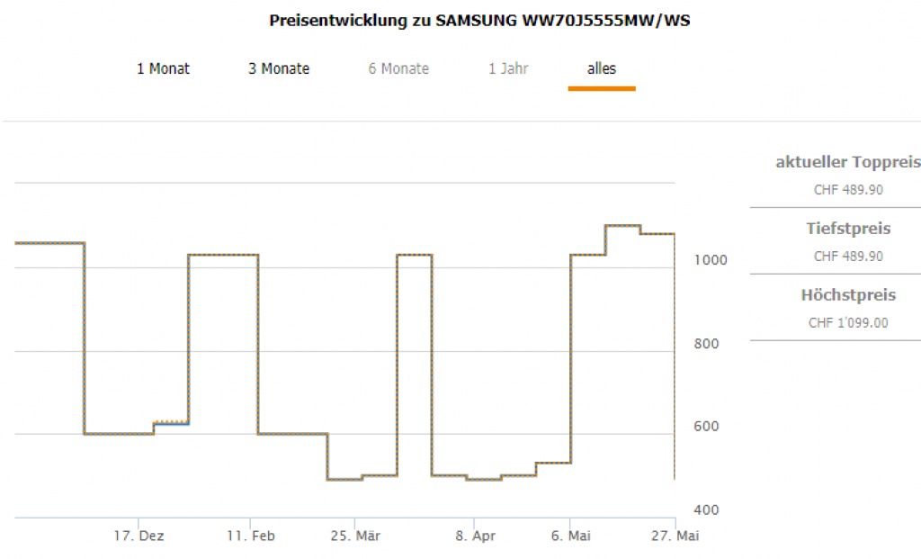 microspot bietet zurzeit die SAMSUNG Waschmaschine WW70J5555MW/WS A+++ für nur CHF 489.90 an. Das ist der schweizweite Bestpreis für das Gerät, den es in der Vergangenheit aber schon mehrmals gab. Dem gegenüber steht ein Vergleichspreis von CHF 1079.-, sodass man hier deutlich sparen kann.