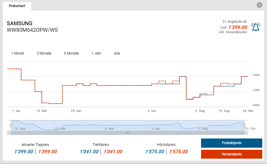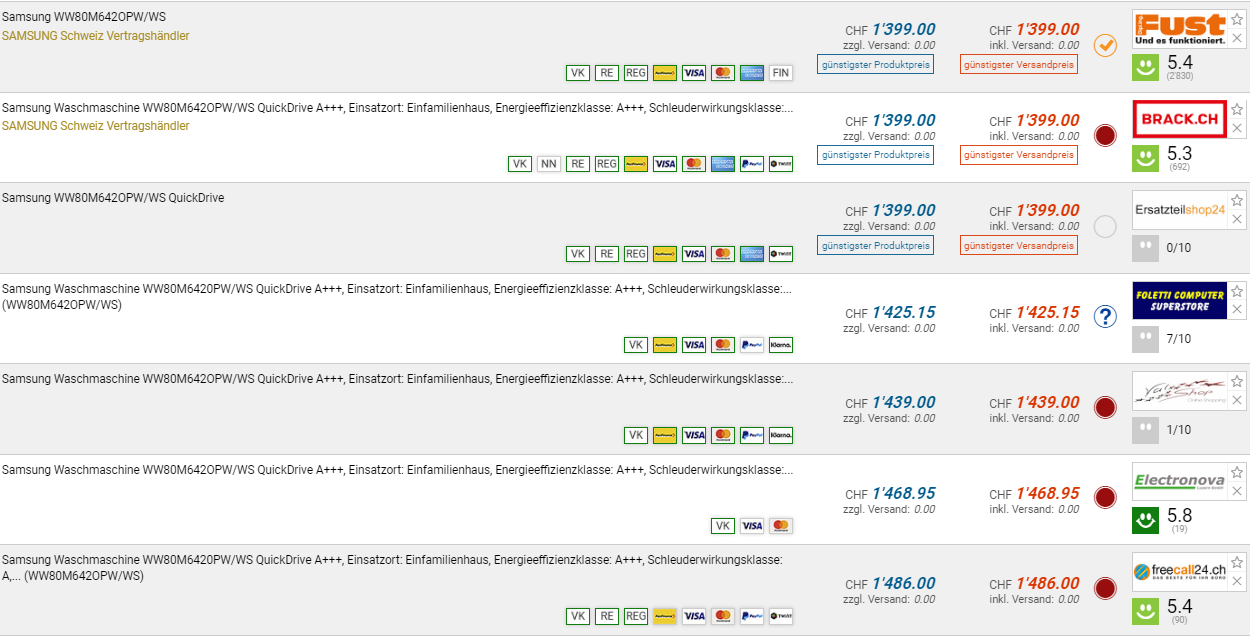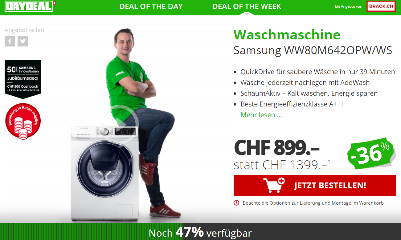 Bei DayDeal gibt es diese Woche noch die Samsung WW80M642OPW Waschmaschine für den neuen Bestpreis von CHF 899.-. Der vorherige Bestpreis war CHF 1041.-. Der zweitbeste Preis beträgt CHF 1399.-.