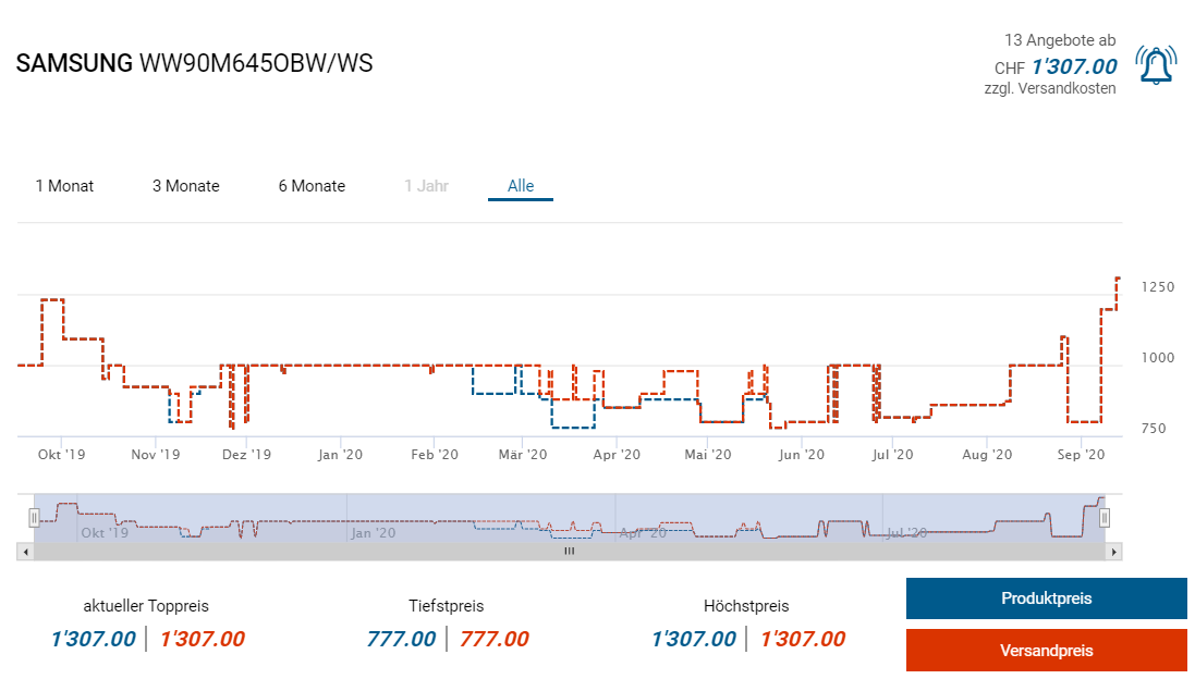 Bei Daydeal gibts im Deal of the Week derzeit eine Waschmaschine von Samsung zum gleichen Bestpreis von 777 Franken wie kurz vor dem Black Friday letzten Jahres. Zurzeit gibts aber einen krassen Preis-Spike, weshalb der Vergleichspreis sehr hoch ausfällt. Lasst euch aber nicht davon täuschen.