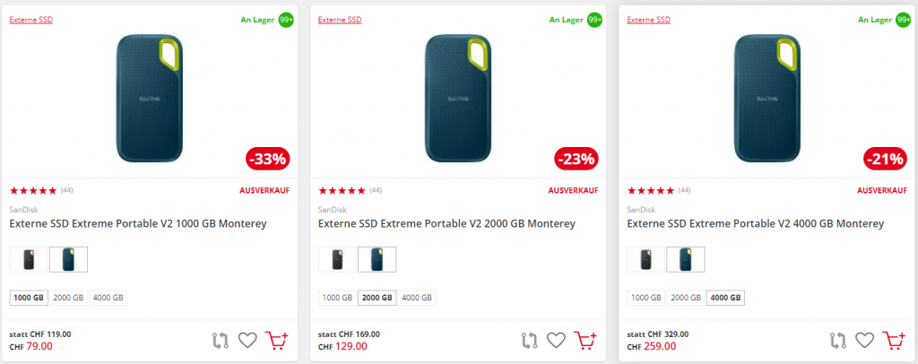 Bsp. Extreme Portbale 4TB für 312 CHF statt 369 CHF. Zweit günstigster auf TP: 322.80 (ohne Lager). Allzeit tiefster Preis auf TP: 312 CHF