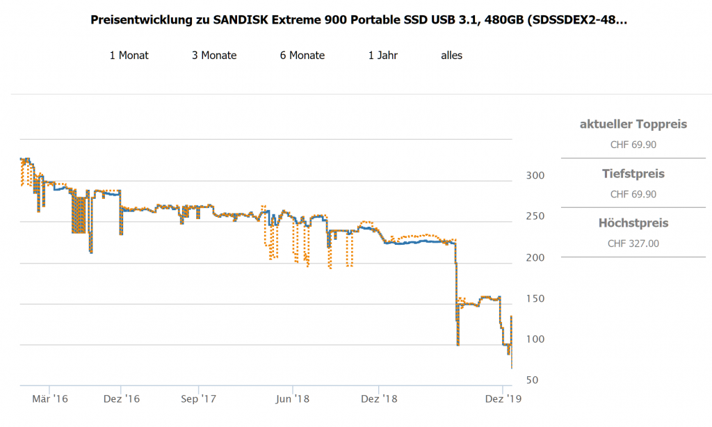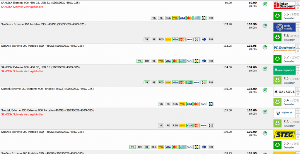 Bei Interdiscount gibt’s gerade die SANDISK Extreme 900, 480 GB, USB 3.1 für CHF 69.90 Zweitbester Preis ist CHF 139.90 Bestpreis bisher war CHF 88.-