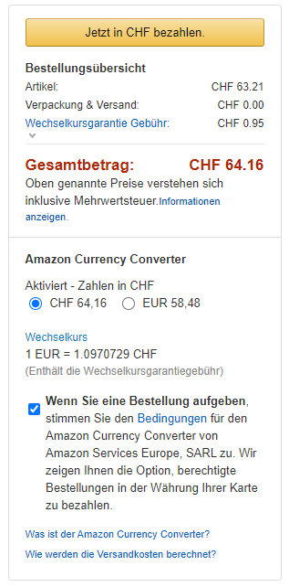 - Für Lieferungen in die Schweiz wird der Preis erst bei Angabe einer Schweizer Lieferadresse richtig angezeigt (Abzug der Mehrwertsteuer, zuzüglich Versandkosten) resp. beim Checkout an der Kasse (Amazon Frankreich, Italien, Spanien und Grossbritannien). Wir verwenden grundsätzlich den Interbanken-Kurs für die Umrechnung in CHF.
