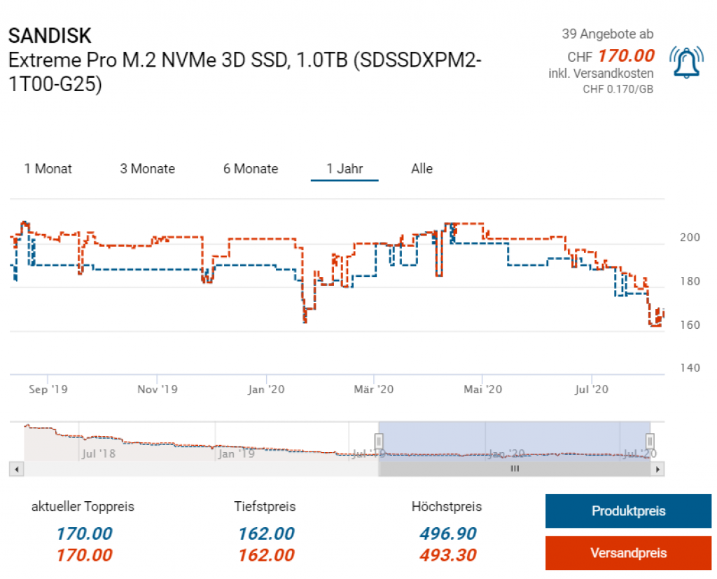 Bei Amazon gibts gerade einen sehr guten SSD-Deal. So gibts die interne SSD mit 1TB Kapazität von Sandisk, der Extreme Pro mit 3.4 GB/s Lesegeschwindigkeit für 126 Franken. In der Schweiz starten die Preise gerade mal bei 170 Franken.