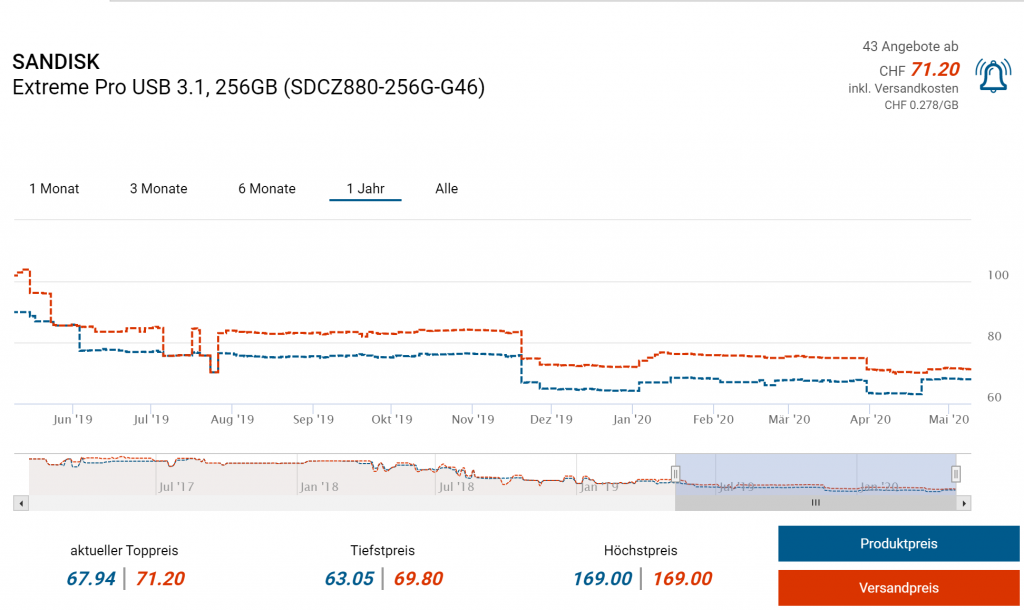 Bei Amazon gibt’s gerade den SANDISK Extreme Pro USB 3.1, 256GB (SDCZ880-256G-G46) für umgerechnet CHF 52.35 inklusive Lieferung in die Schweiz und Verzollung. In der Schweiz bezahlt man ab CHF 71.20 63.40 Das ist gleichzeitig auch Bestpreis für die Schweiz.