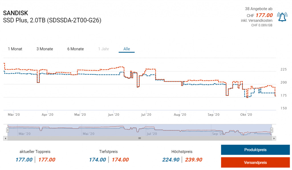 Bei Amazon gibts derzeit die SSD Plus von Sandisk mit 2TB Speicherkapazität zum Aktionspreis von knapp 160 Franken. Laut toppreise beträgt der Vergleichspreis derzeit 177 Franken.