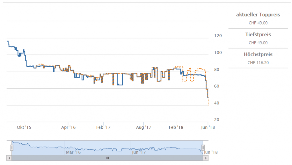 Wählt man Abholung statt Lieferung oder bestellt zwei Stück, gibt’s den Stick sogar für CHF 39.20. Der zweitbeste Preis in der Schweiz liegt bei CHF 69.50. Zuvor gab’s den Speicherstick nie unter 60 Franken.