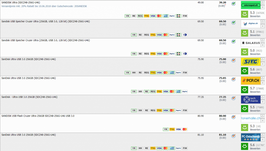 Bei microspot gibt’s gerade den Sandisk Ultra 256GB Speicherstick für CHF 48.10, wenn man den Gutscheincode 20SANDISK einsetzt. So „teuer“ ist der Stick aber nur wegen dem Mindermengenzuschlag für Bestellungen unter 50 Franken.