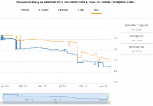 Die SanDisk Ultra microSDXC mit 128GB gibt es für nur 20 chf mit Gratis Lieferung, laut toppreise.ch ist es momentan best preis.