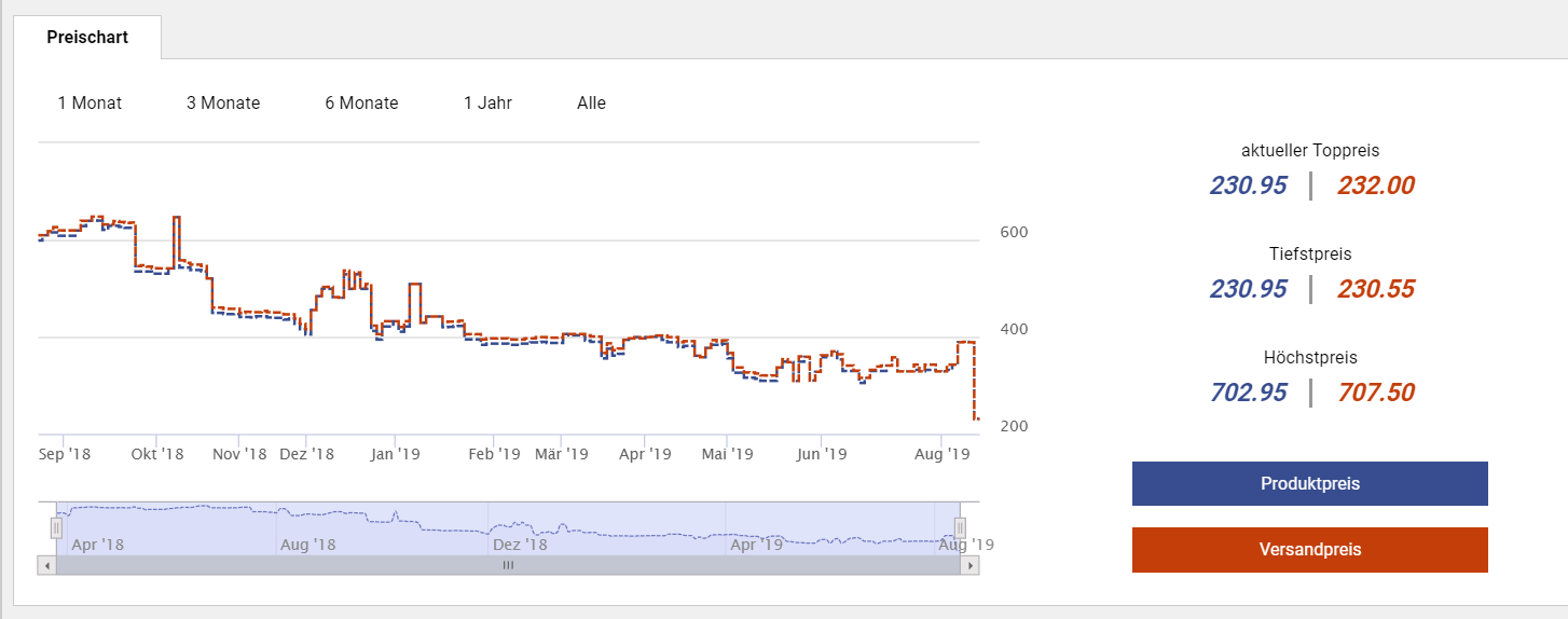 Hab‘ als Vergleichspreis mal Steg etc. genommen. Die anderen Angebote um die 240.- sind alle nur ab Fremdlager verfügbar, was (den vergangenen beiden Tagen nach zu urteilen) ziemlich sicher ein Storno zur Folge hat.