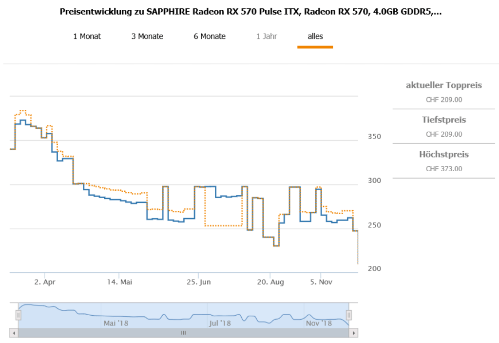 Bei digitec gibt es aktuell die SAPPHIRE Radeon RX 570 Pulse ITX, 4.0GB GDDR5, Lite Retail für 210.- CHF. Gemäss toppreise war der best price bislang bei 229.90 CHF, der zweitbeste Preis aktuell liegt bei 269.90 CHF.