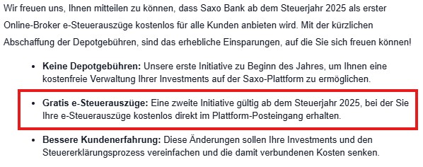 Ich habe gerade per E-Mail von Saxo Invest die Info erhalten, dass ab dem Steuerjahr 2025 die eTax Steuerreports neu kostenlos sind (statt wie bisher CHF 100.-). Das macht Saxo Invest definitiv noch attraktiver als CH Broker für ETF, Aktien und Sparpläne!