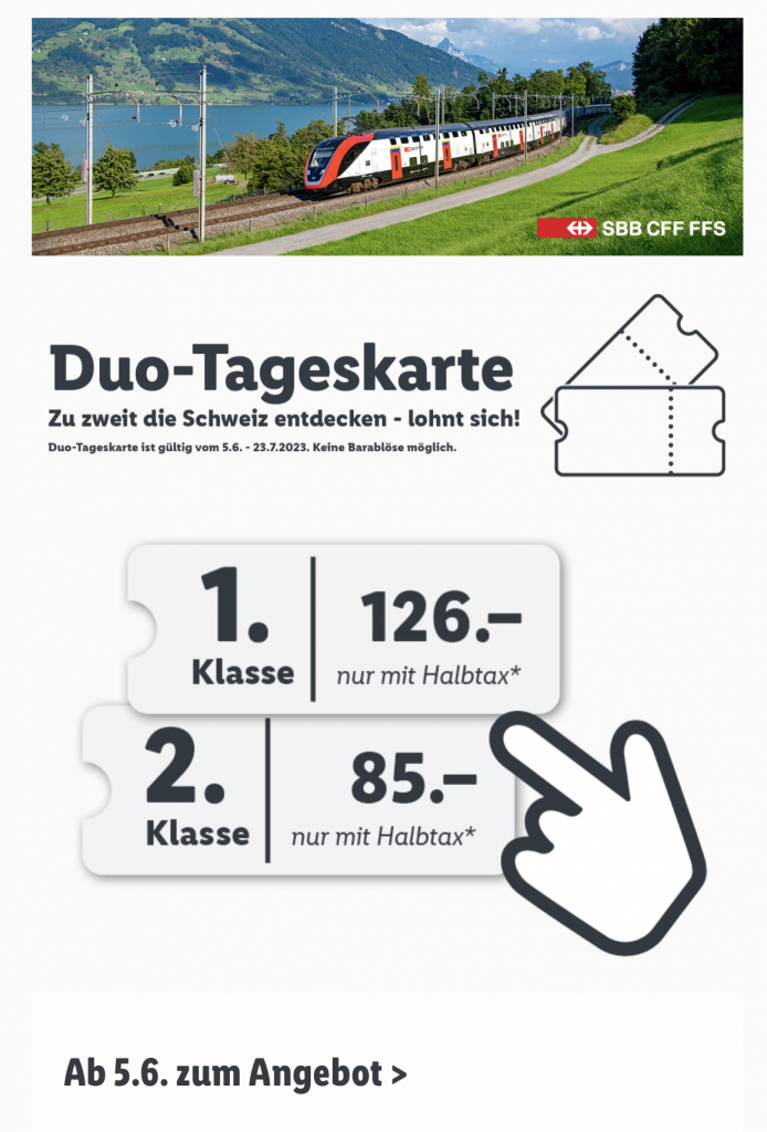 - Die Duo-Tageskarte kann über den Webshop, sbb.ch/lidl, bezogen werden. Die Duo-Tageskarte ist eine Tageskarte für 2 Personen, wobei 1 Person in Besitz eines gültigen Halbtaxbabonnements sein muss.