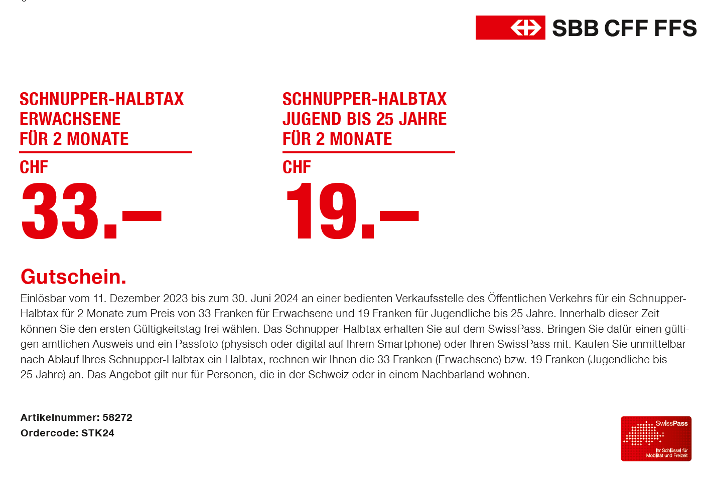 Schnupper-Halbtax gültig für zwei Monate zum Preis von 33 Franken.