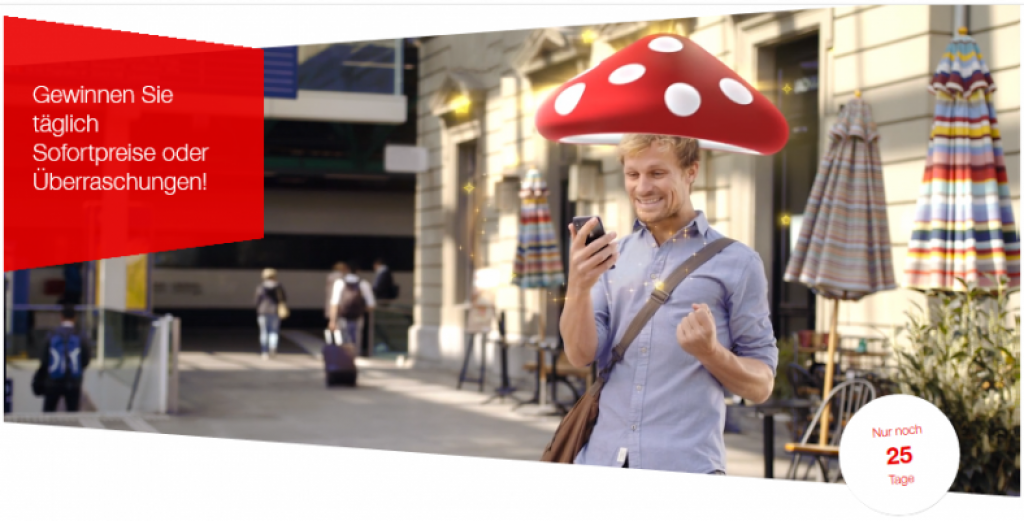 Bei der SBB gibt es aktuell ein tägliches Gewinnspiel. Man hat die Chance auf Kaffe, Gipfeli und co. – wer nichts gewinnt bekommt täglich einen Gutschein (Bsp. 6-fache Superpunkte).