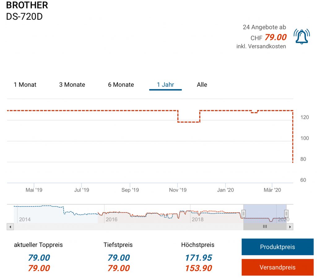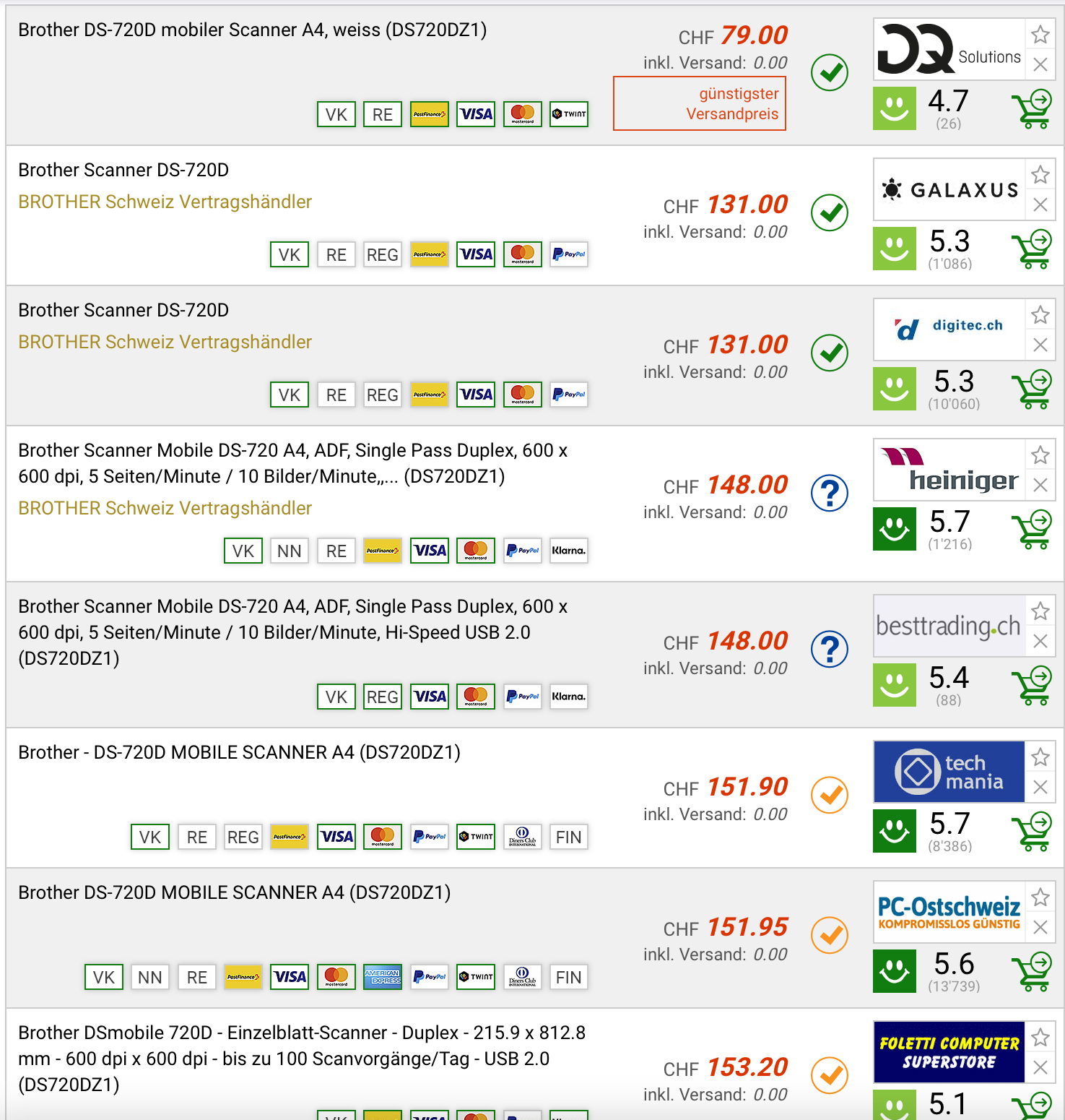 Bei DQ gibt es aktuell den BROTHER DS-720D Scanner für 79.- CHF. Zweitbester Preis gemäss toppreise sind 131.- CHF.