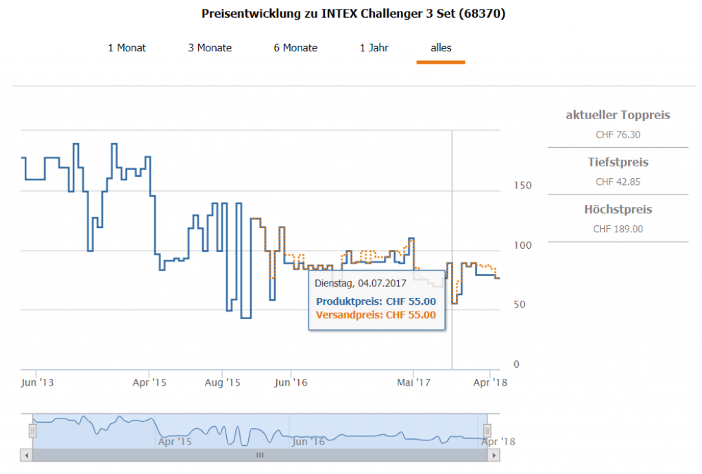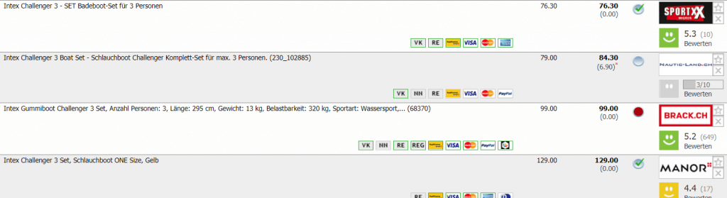 Dieses Schlauchboot bekommt man mit Paddel und Luftpumpe. Ein Schnäppchen sondergleichen, nur ein Mal, vor ca. einem Jahr, gab’s das Schlauchboot-Set für 55.- Seither liegt der günstigste Preis immer bei ca. 75-85 Franken.
