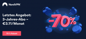 Vor einigen Tagen hat NordVPN angekündigt, dass das 3-Jahres-Paket nach ein paar Wochen abläuft. Jetzt ist also die letzte Chance, von diesem Angebot zu profitieren (70% Rabatt, 3.11€/Monat für 3 Jahre).
