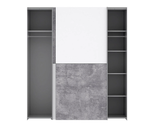 Der Schrank LINE 2 ist ein schöner, funktionaler und praktischer Schrank, der sich perfekt für jedes Zuhause eignet. Er verfügt über ein innovatives Design mit zwei Schiebetüren. Dank seinen Regalen bietet dieses Produkt viel Platz zum Verstauen von Ihren Gegenständen. Die Innenausstattung ist darauf ausgelegt, Ihnen maximalen Stauraum zu bieten. Dieser Schrank besteht aus Spanplattenmaterial, das Haltbarkeit und Langlebigkeit gewährleistet. Dieses Modells ist in modernem Weiss und Beton gefärbt.