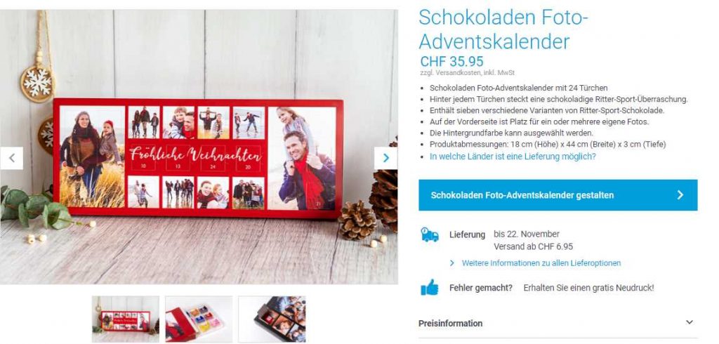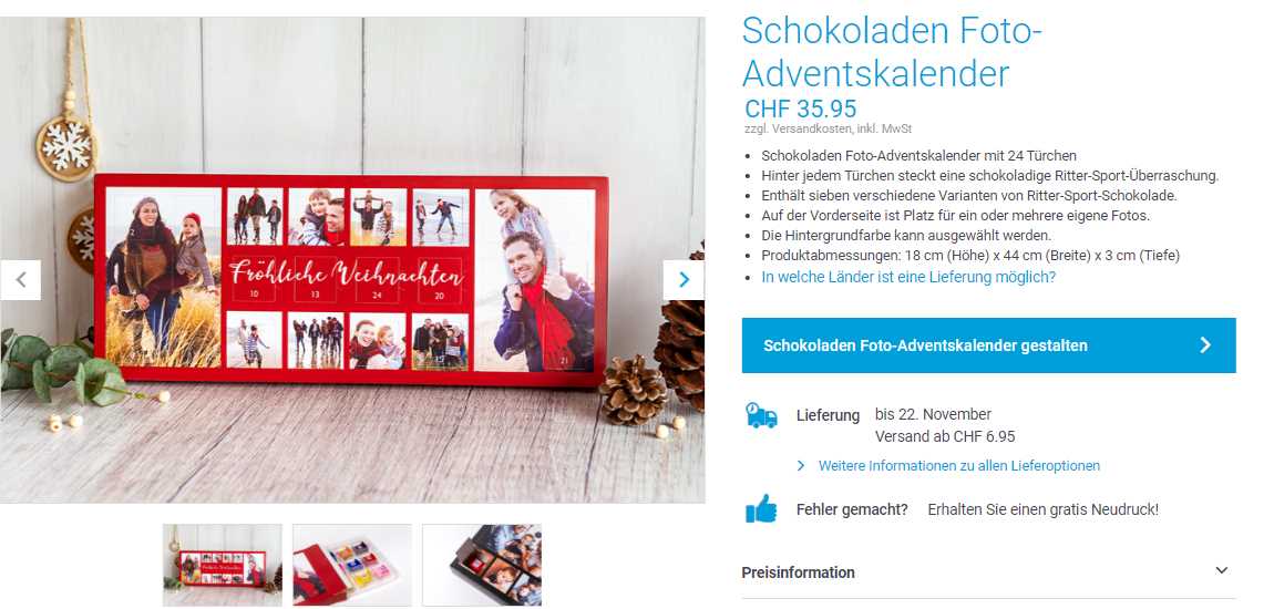 Bei smartphoto gibt es seit kurzem den Schokoladen Foto-Adventskalender. Mit dem Code XM19AF01 erhält man 25% Rabatt. Also kostet er nur noch CHF 26.96 anstatt CHF 35.95 Die Lieferung ist ab CHF 50.- gratis.
