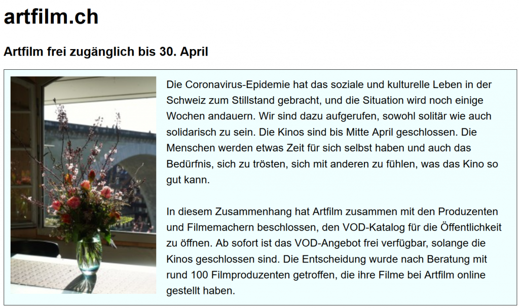 Das Streaming Portal artfilm.ch hat eine grosse Auswahl an Spiefilmen, Dokumentationen und Kurzfilmen von Schweizer Autorinnen und Autoren. Diese sind nun wegen der Coronakrise bis Ende April 2020 gratis verfügbar.