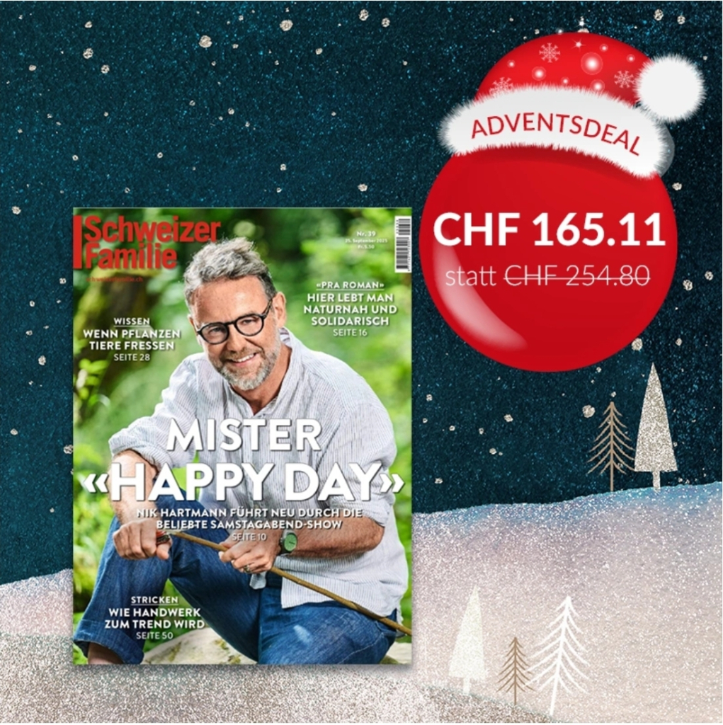 Aktuell ist das Jahresabo (52 Ausgaben/wöchentlich) der Zeitschrift «Schweizer Familie» bei abo-direkt.ch als Adventsdeal zum reduzierten Preis von 165.11.- statt 254.80.- erhältlich.