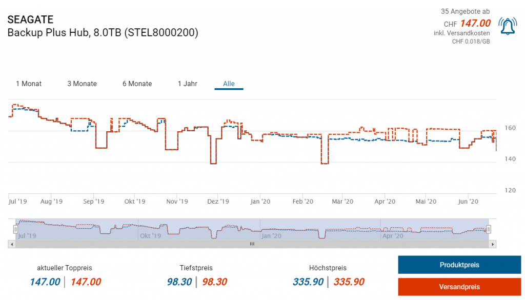 Bei Amazon gibts gerade den 8TB grossen Hub von Seagate in Aktion für 124 Franken inkl. Lieferung in die Schweiz. Laut toppreise soll es das Produkt schon mal für etwas weniger als 100 Franken gegeben haben, auf dem Graphen ist aber kein solcher Hick sichtbar (könnte sich also um einen Preisfehler gehandelt haben).