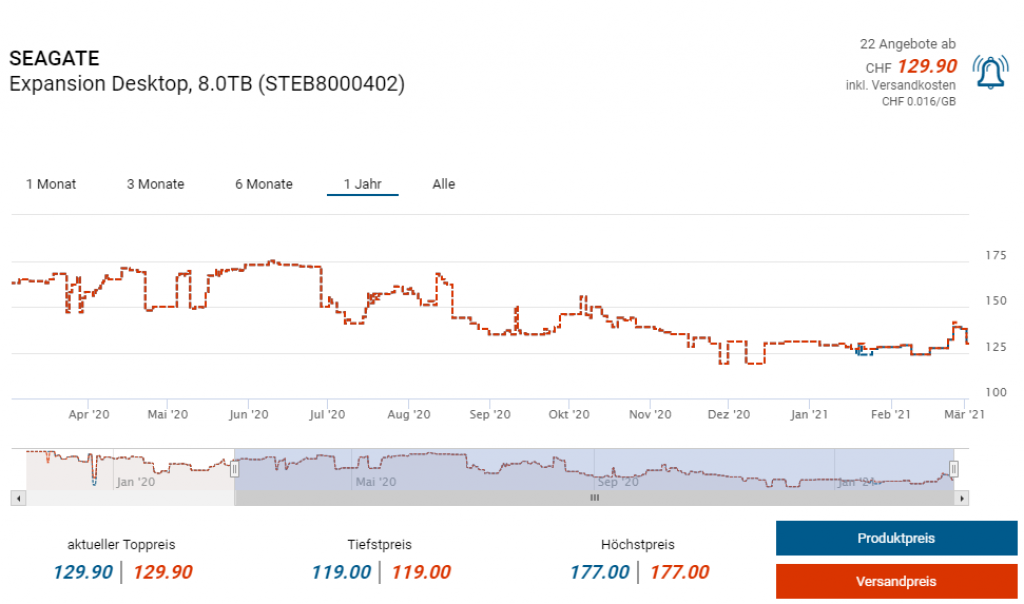 Bei Interdiscount gibts zurzeit die 8TB fassende HDD Expansion Desktop von Seagate mit der Herstellernr. STEB8000402 zum Aktionspreis von knapp 130 Franken. Mit dem bekannten 10 Franken Bon drückt ihr den Preis etwas weiter runter.