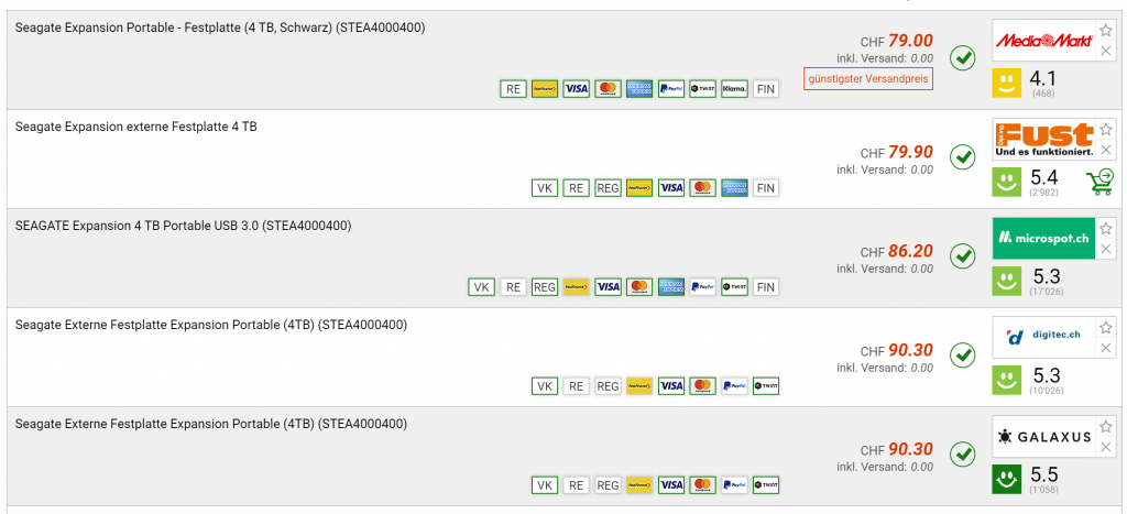 Bei MediaMarkt gibt’s die SEAGATE Expansion Portable Festplatte (4 TB, Schwarz) für CHF 79.- Das ist der gleiche Bestpreis, den es vor einiger Zeit schon einmal gab. Zweitbester Preis ist mit CHF 79.90 bei Fust nur leicht darüber, trotzdem ein nettes Angebot.