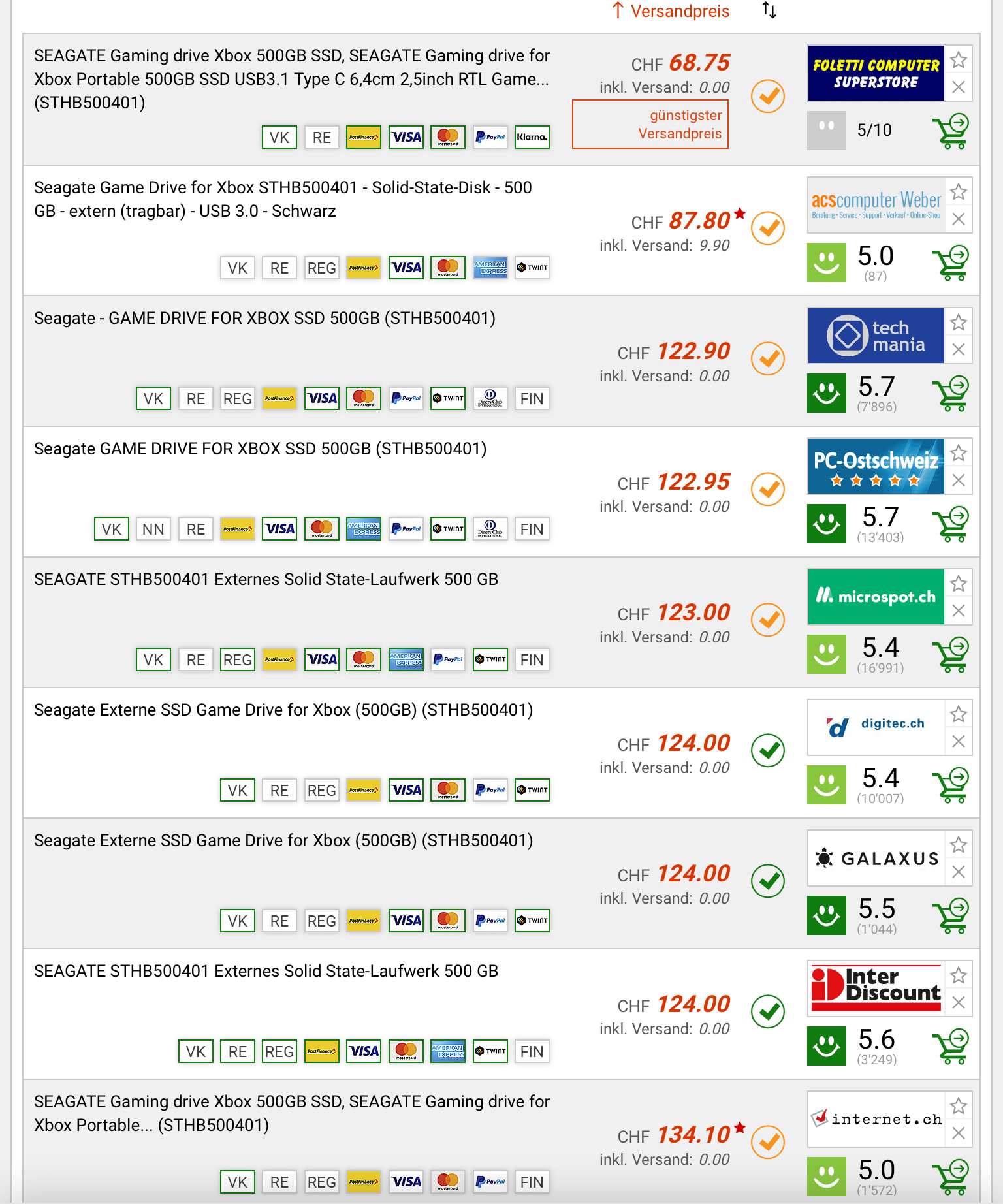 Bei Foletti computer superstore gibt es das SEAGATE Game Drive for Xbox SSD, 500GB für 68.75 CHF. Gemäss toppreise liegt der zweitbeste Preis bei 87.80 CHF.